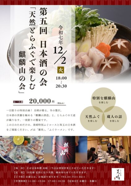 第5回日本酒を楽しむ会は、「天然とらふぐで楽しむ麒麟山の会」です。